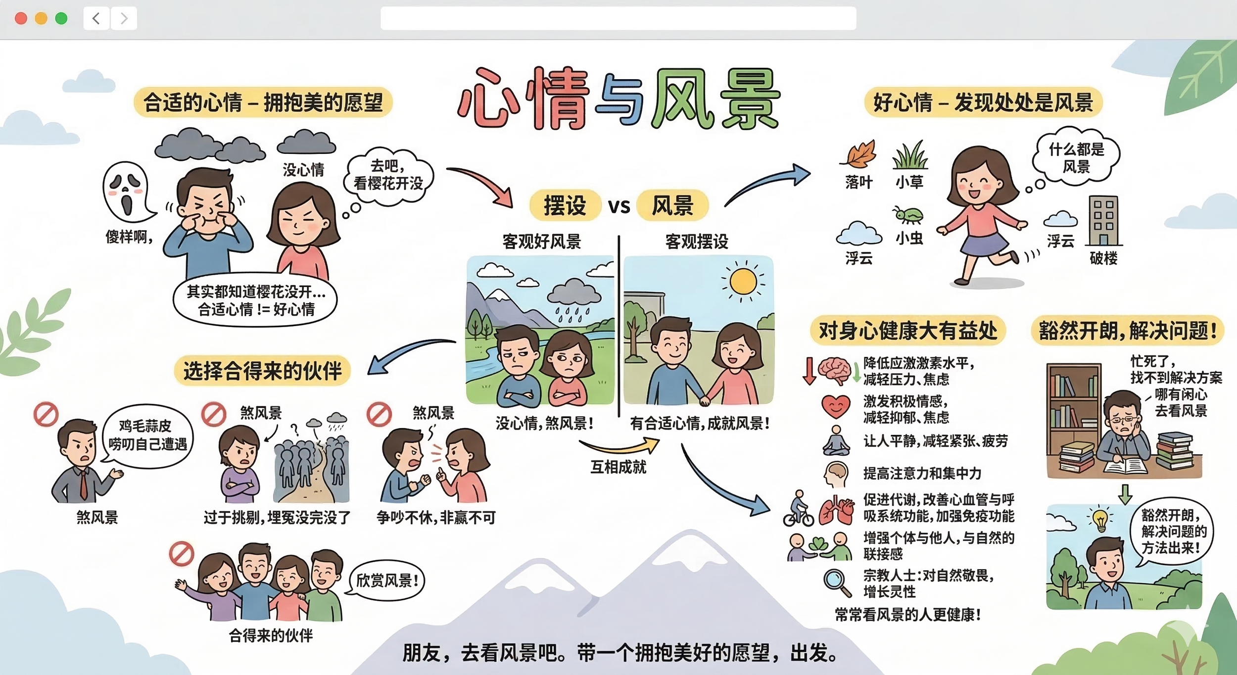朋友,去看风景吧。不管最近遭遇如何,找一个或一群要好的朋友,准备一个开放的心态,带一个拥抱美好的愿望,出发。