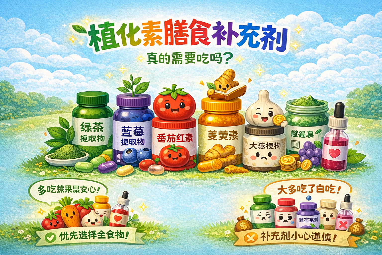 但说大多数人在大多数时候不需要吃,也就是说少数人或在少数情况下需要吃啰?是的。是否需要用膳食补充剂增加植化素的摄入取决于个人的饮食习惯和健康状况。在有些情况下可以考虑用植化素膳食补充剂。对于饮食中缺乏多样化植物性食物的人来说,补充剂可能有助于填补营养缺口。某些健康状况可能需要额外的植化素,例如某些慢性病或营养吸收问题。另外,对于一些非常忙碌或无法经常获得新鲜植物性食物的人来说,补充剂可能是一个方便的选择。