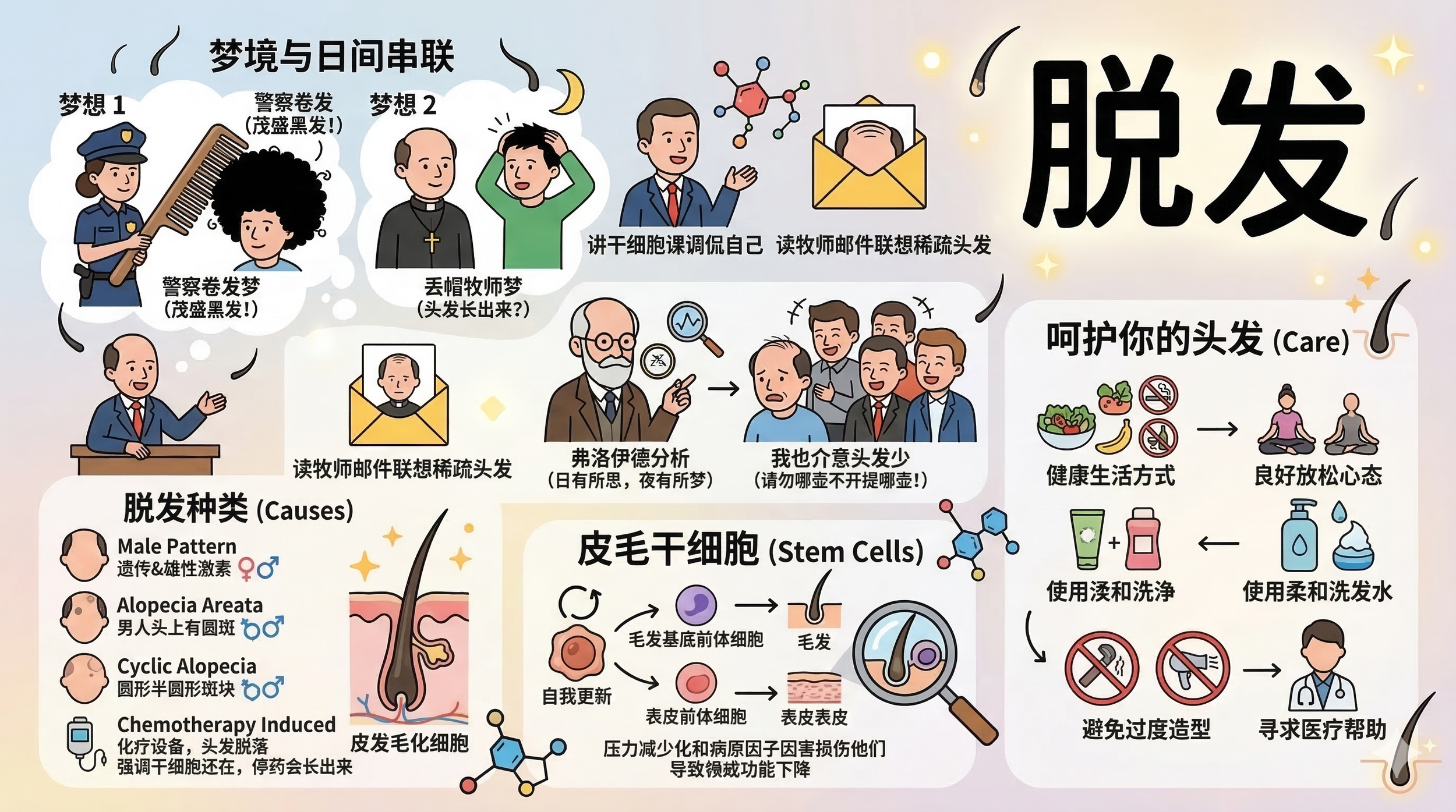 白天发生了两件事。一件是下午我给学生讲课,讲到了皮毛干细胞,干细胞怎样变成头发,还调侃了一下自己的头发,说我自己就需要皮毛干细胞更多分化成毛发基底前体细胞和头发。另一件事是,傍晚时读到牧师给大家发的一个电子邮件,说有个弟兄钱包丢在教会了,问有没有人捡到,看到这邮件时脑子里飘过了牧师渐渐稀疏的头发。人的大脑确实神奇,白天一些看似不相干但又相连的事情,居然在梦里胡乱地串联起来了,真是日有所思,夜有所梦呵。什么时候请弗洛伊德分析一下,看这两个梦与我童年的经历也有关系没。